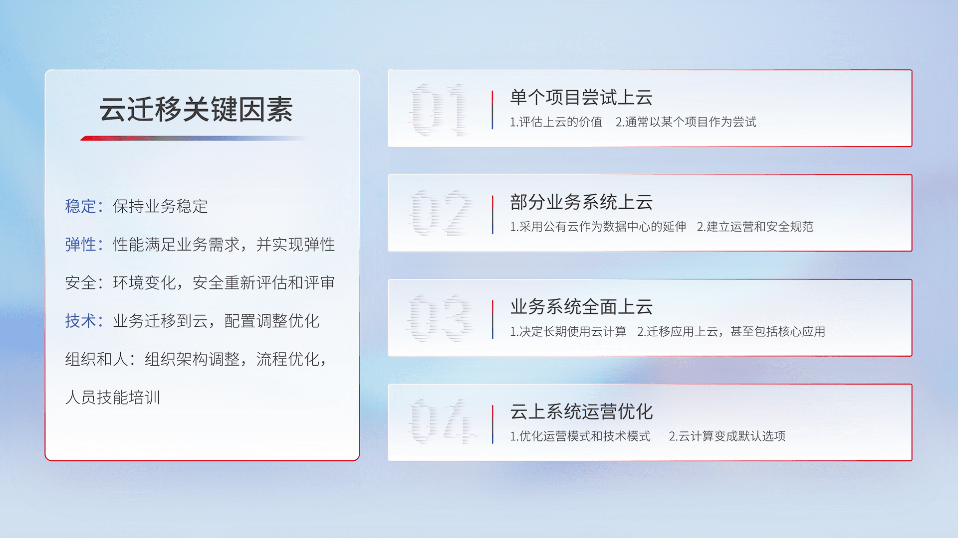 结合实际业务,,,从规划设计、、、、云平台选型、、、、云原生改造、、数据迁移、、集成交付,,迁移全过程为客户识别最佳上云路径,,,,做好风险识别管理,,设计网络架构、、身份权限、、、、安全审计合规、、操作审计、、、日志审计、、监控告警策略、、、多站点容灾设计等,,对云上基础设施进行整体规划,,,,提升IT治理水平,,,,以满足弹性、、、、高可用、、、高性能的需求。。。
